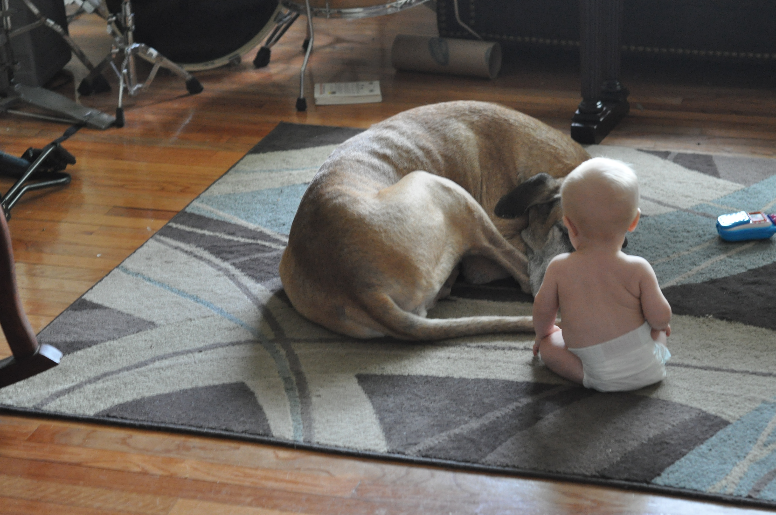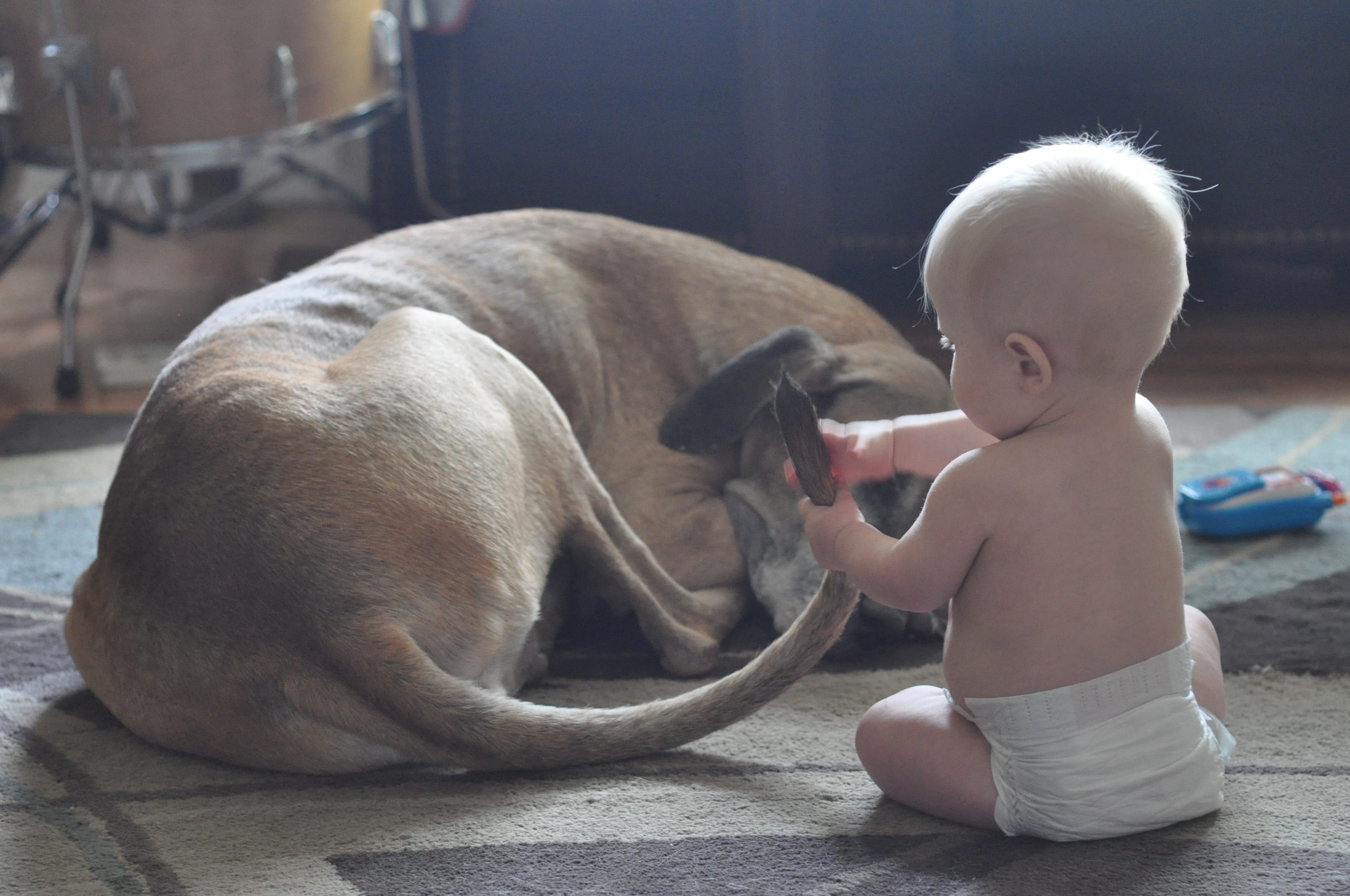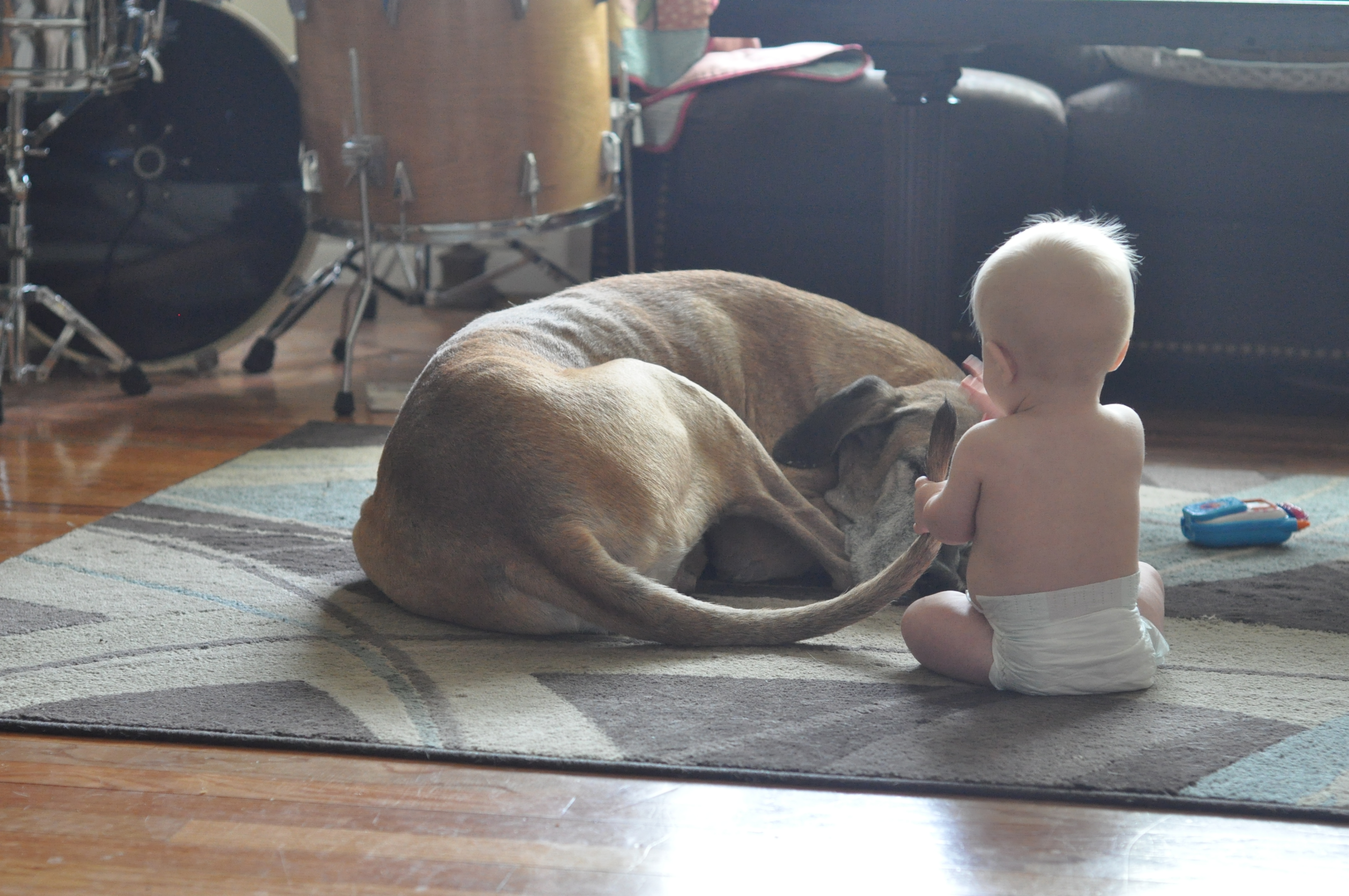 G has no fear when it comes to our dogs (or anything else for that matter). Here are some pics of G playing with her. She tolerates a lot and I think she enjoys the attention! These pics were taken in late June so G had just turned 6 months old. He is now crawling everywhere, pulling up and starting to take steps holding on to fingers or tables/couches.