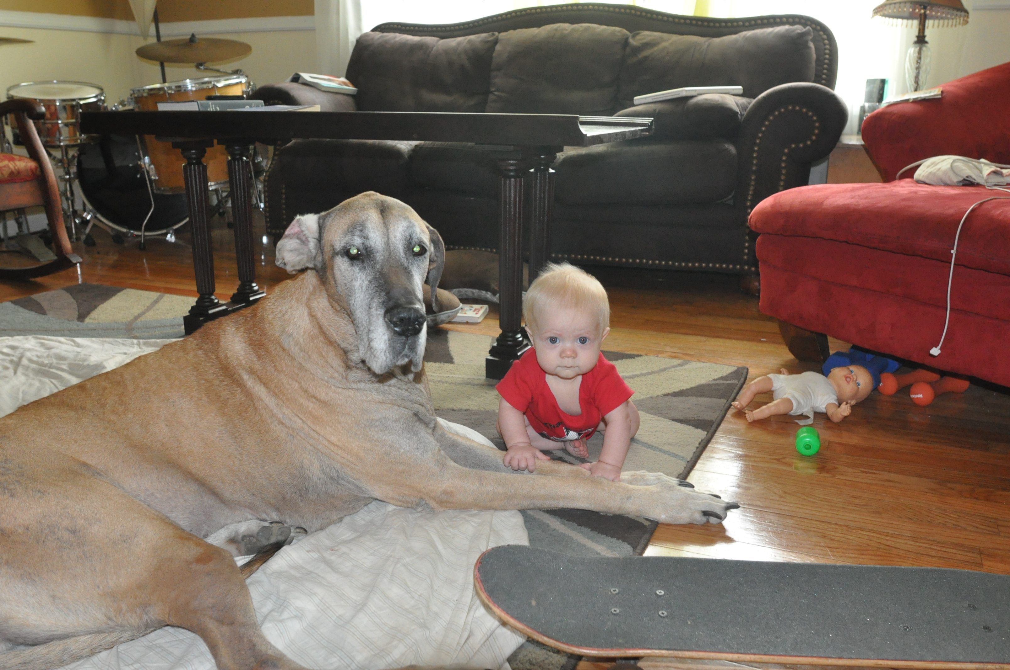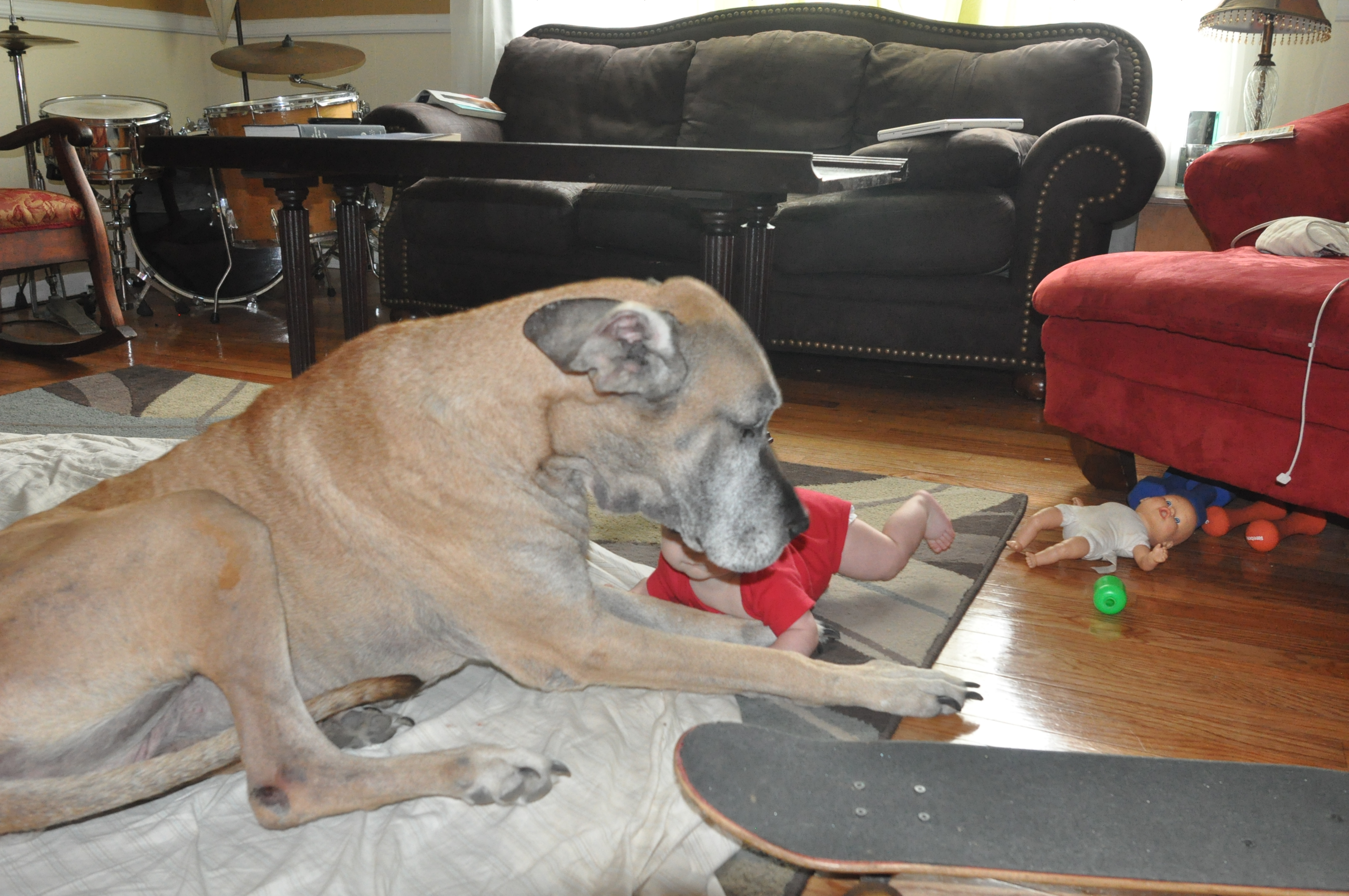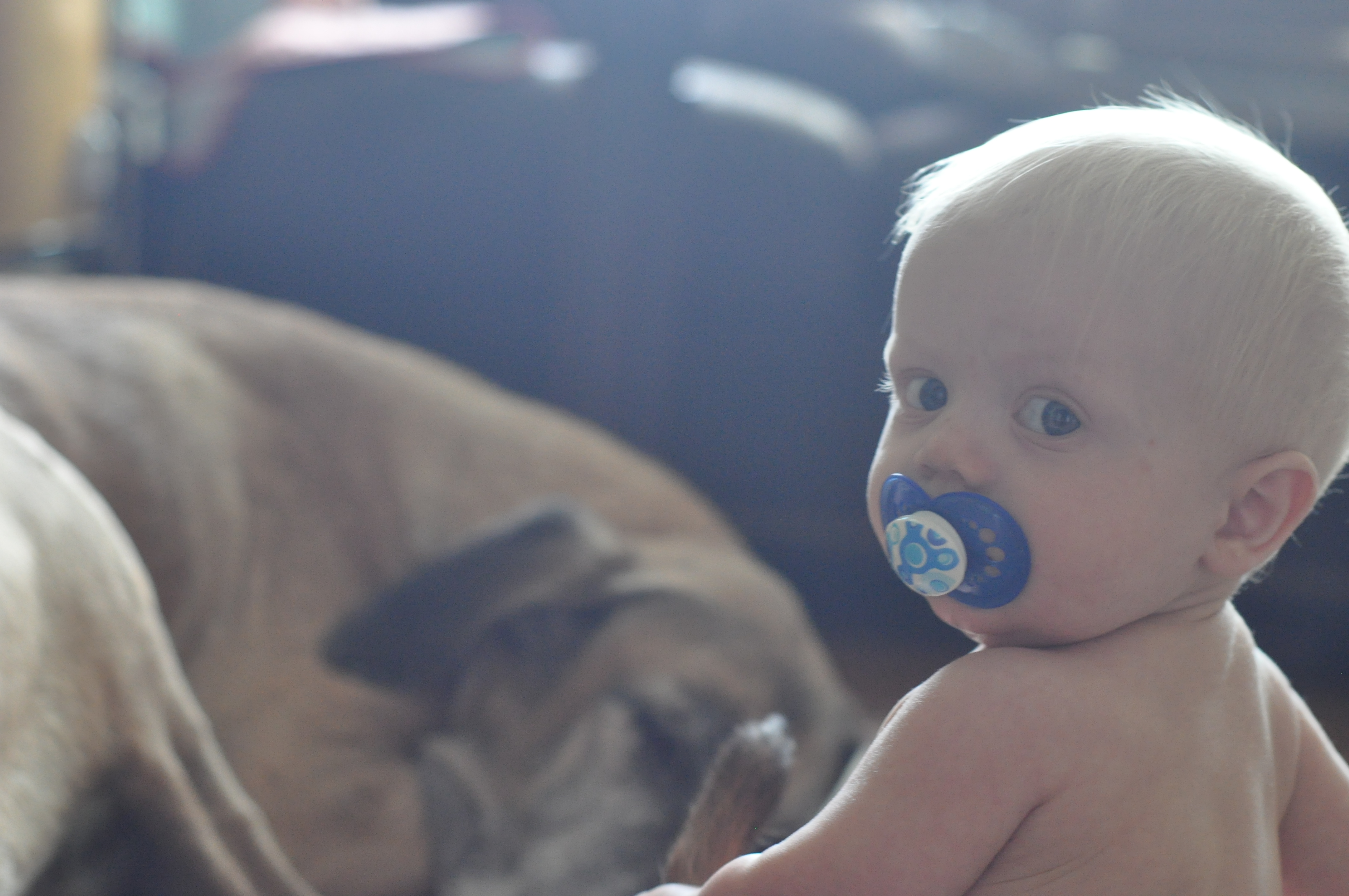 G has no fear when it comes to our dogs (or anything else for that matter). Here are some pics of G playing with her. She tolerates a lot and I think she enjoys the attention! These pics were taken in late June so G had just turned 6 months old. He is now crawling everywhere, pulling up and starting to take steps holding on to fingers or tables/couches.