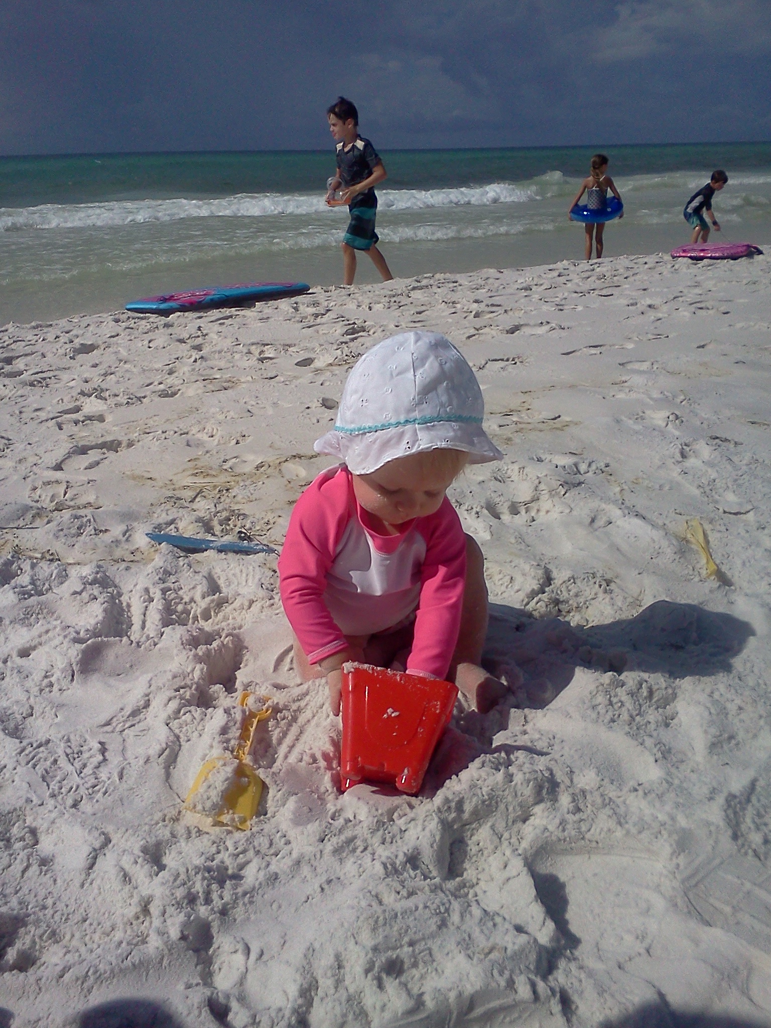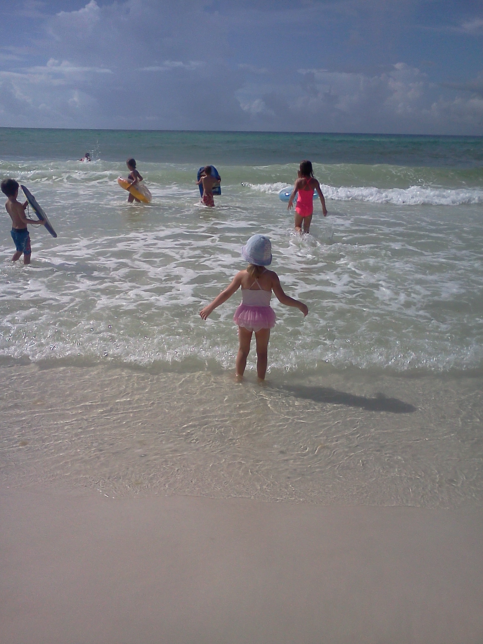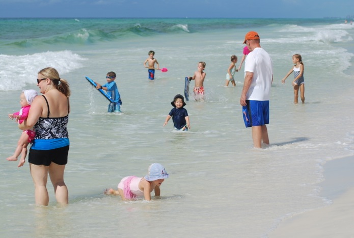 We have been “rowing”* Jenny’s surprise summer for the past 2 weeks. As go-along books** to this book, we have been studying climate, seasons, waves, tides, oceans and caves. I wanted to have a hands-on lesson to what we have been studying so I decided to take the kids to the beach. My dad was a trooper and decided to come with me to help AND my sister’s sister-in-law, Jordan, was in Destin for a few days. It was so fun catching up with her and hanging out with her kiddos. I was so thankful that Jordan brought a nice camera and she was kind enough to send me some pictures from the morning. The kids ended up learning about rip currents and how the weather affects the waves; the flag was yellow but the rip current was very strong and the waves became more rough as we were there. My kids had no fear of the ocean so I took them out individually to where I was standing hip-deep. I had a difficult time standing still as I was getting knocked over by the waves. This lesson helped them have a deeper respect for the power of the ocean. All 3 kids LOVED the water and splashing around. We ended up only staying about an hour (I was exhausted just from trying to keep each child within sight and above water) but made some great memories. I hope to visit the beach more this year during off-season than in years past. Enjoy the pictures!