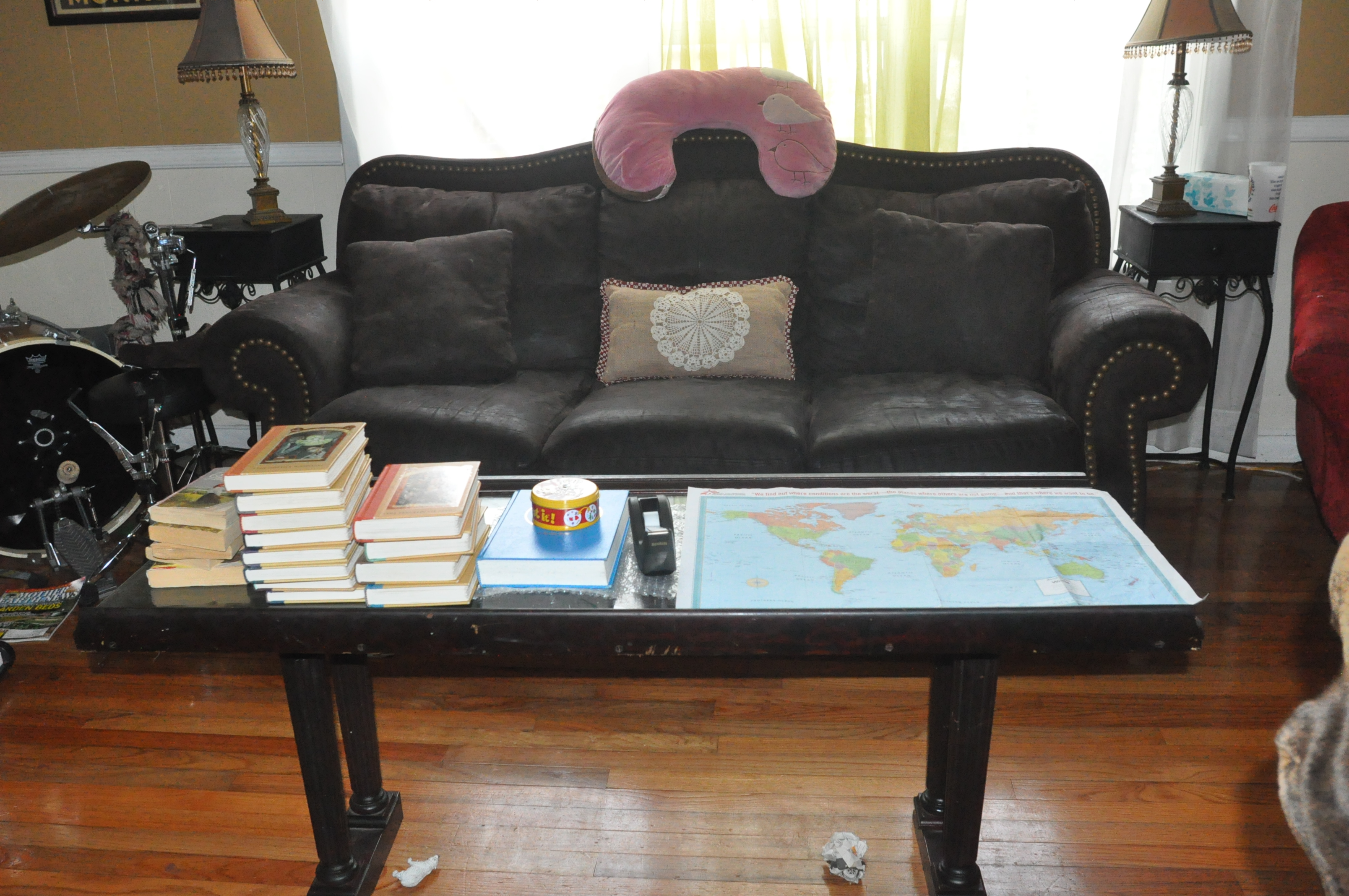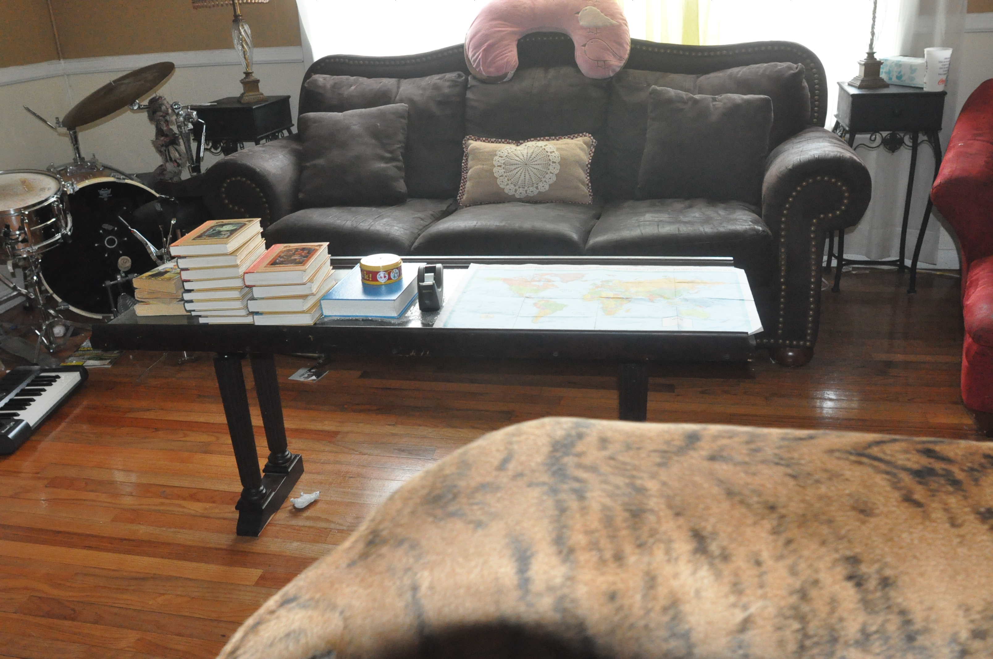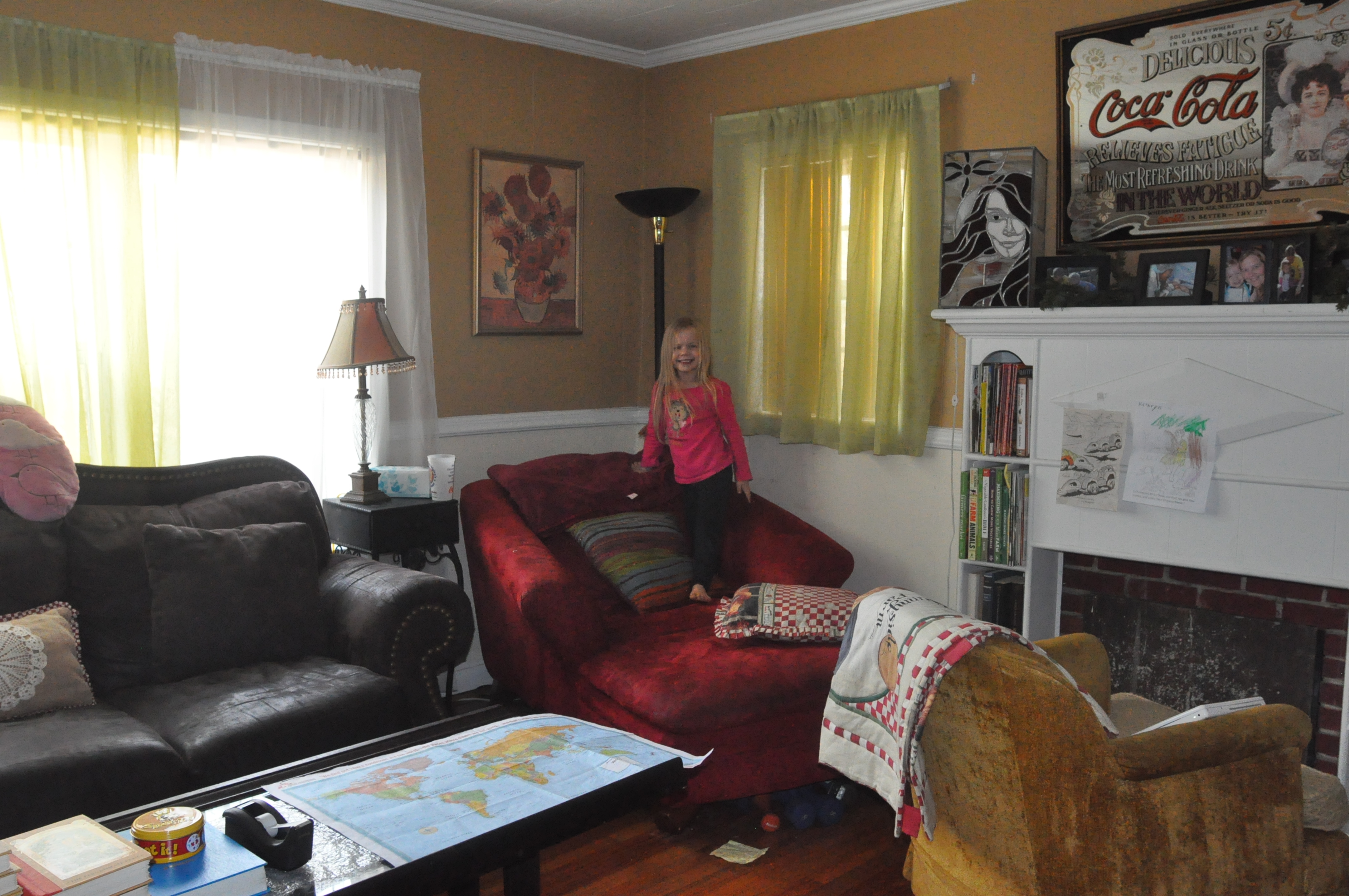 I haven’t posted pictures of the kids lately so I thought I would post an update. K is such a fun-loving kid and definitely keeps us on her toes with her questions! Last week, she “decorated” the living room. She loves maps, so it wasn’t surprising that she made the map the center of the room.