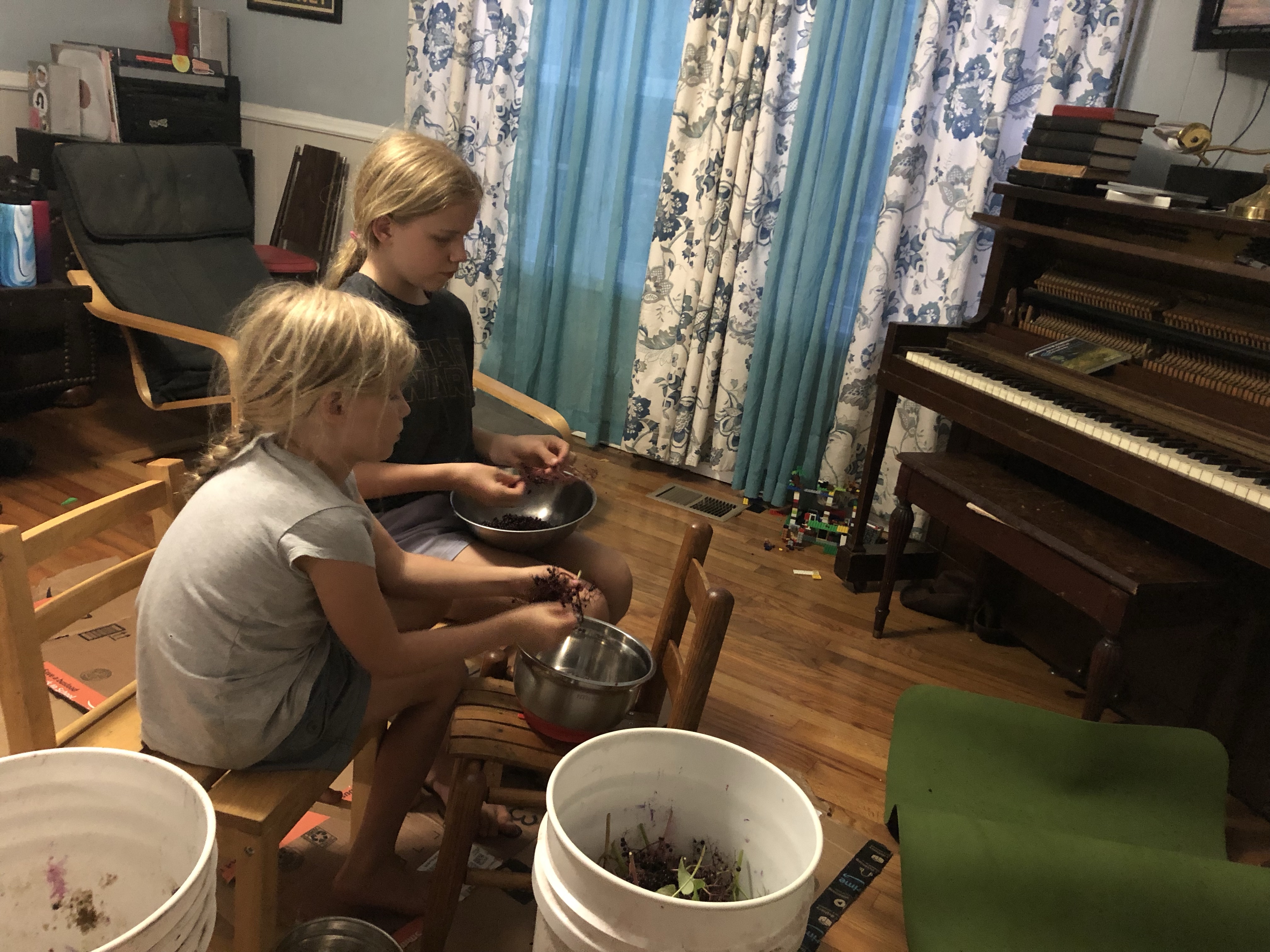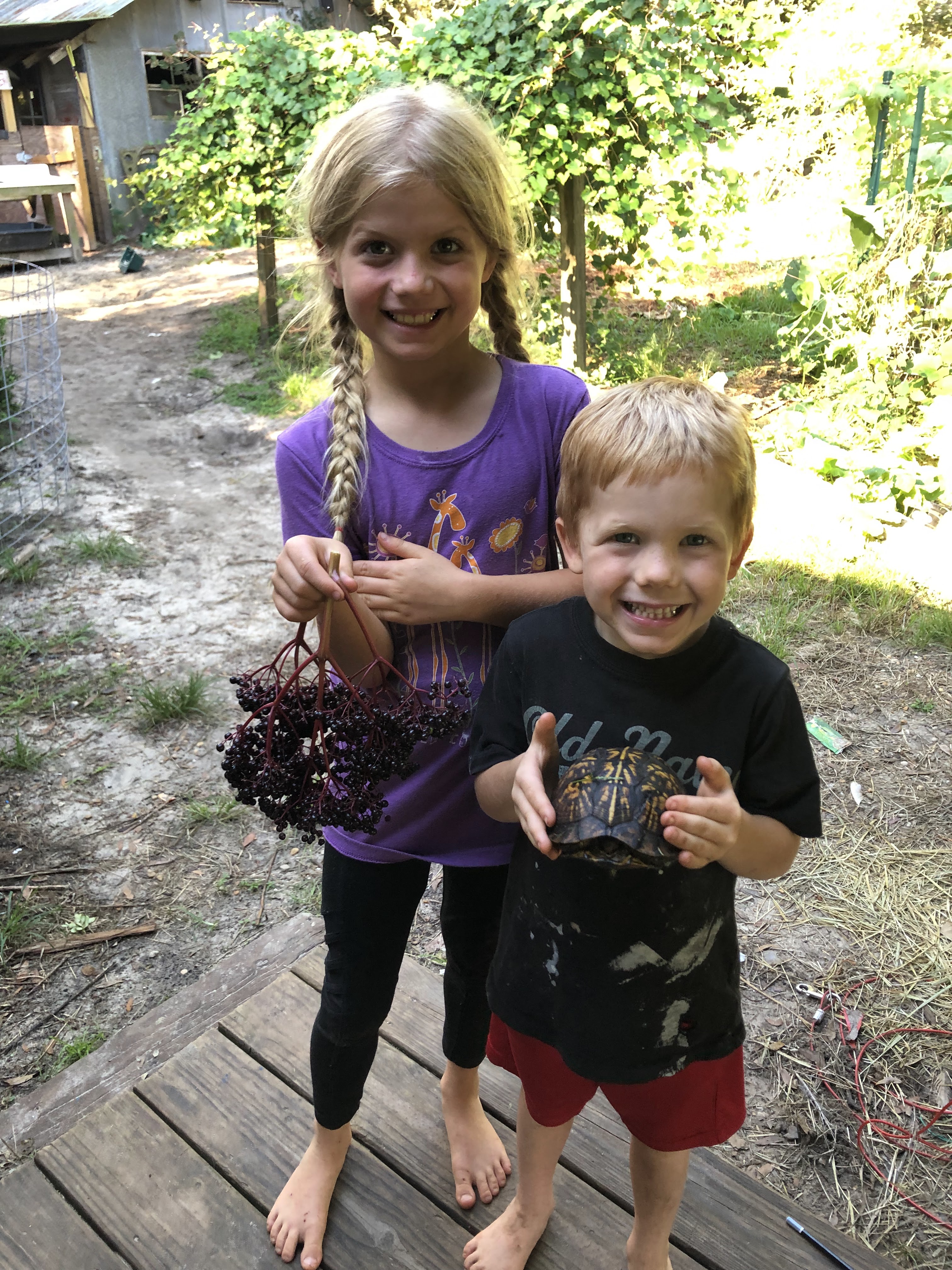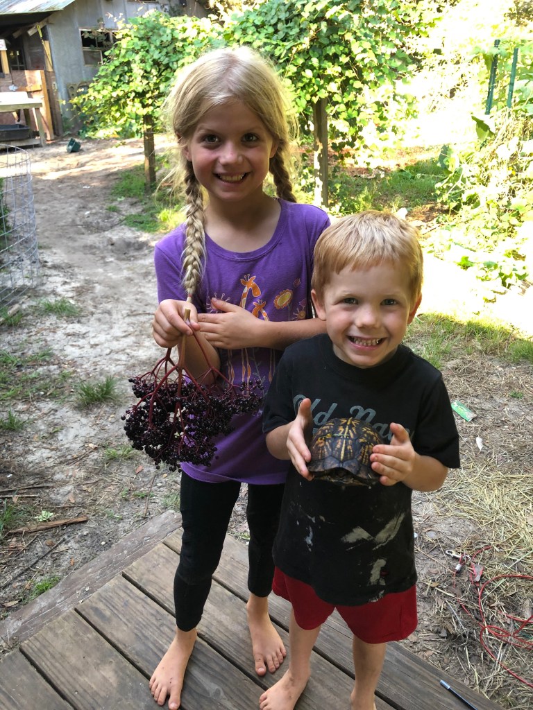 I’ll spare you the details but I drove around for thirty minutes with no luck. But on my last circle around, I saw a beautiful bunch of elderberry that I couldn’t leave behind. Then on my way back to the house, there was a turtle in the road. I put the elderberry in the front seat and the turtle in the back and headed home. When I arrived home, the kids came out and said “Mama, the Spanish lesson was short, so we did Biology as well.” And then they headed out to Woven Hand Wood (more details to come on that soon) to look for the dogs. Turns out they were out there frolicking the entire time.