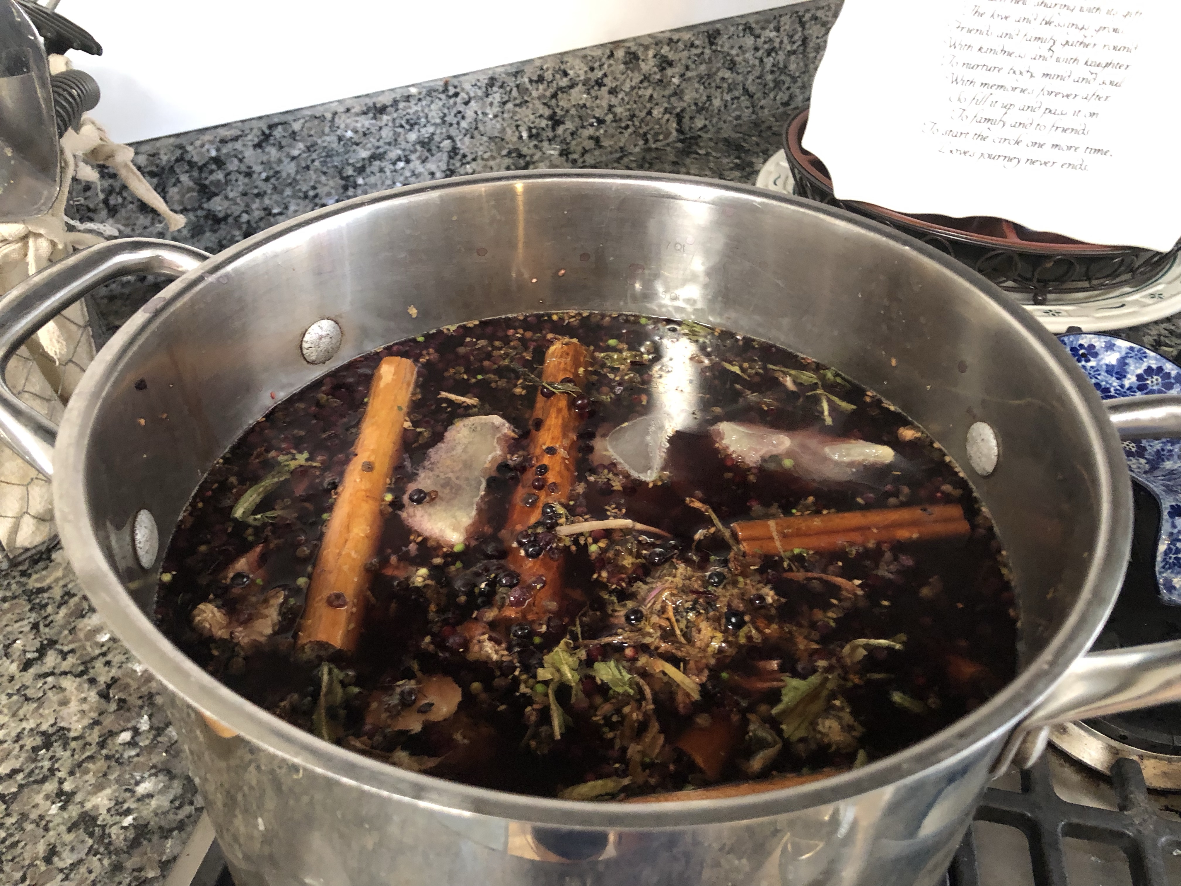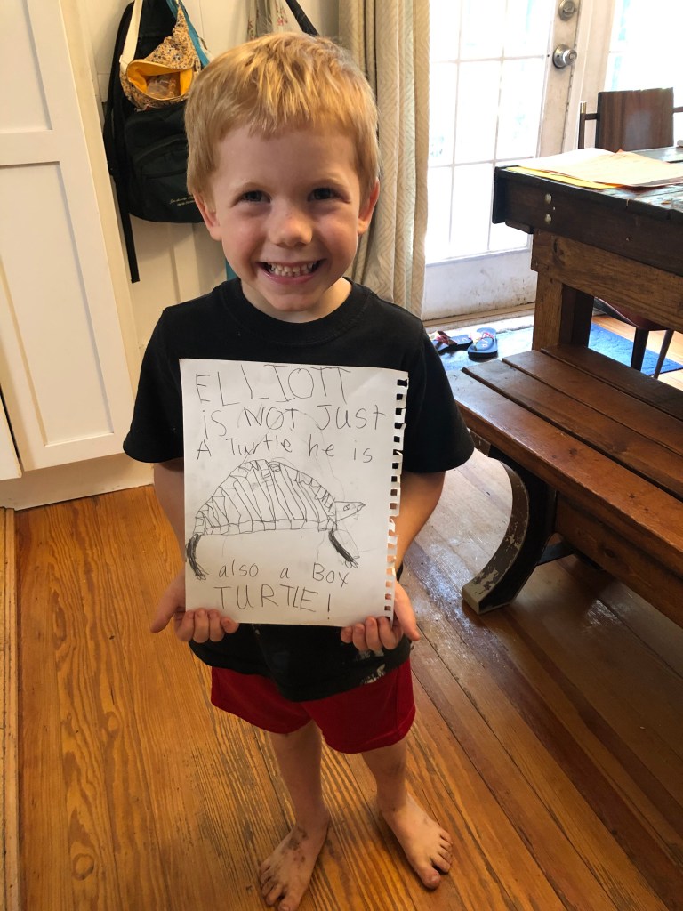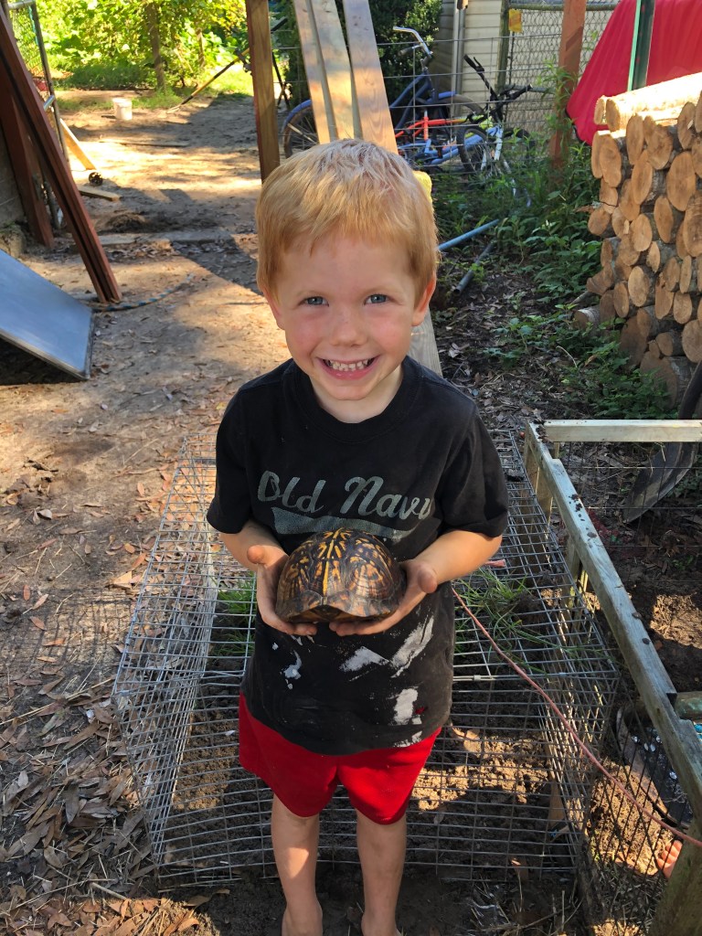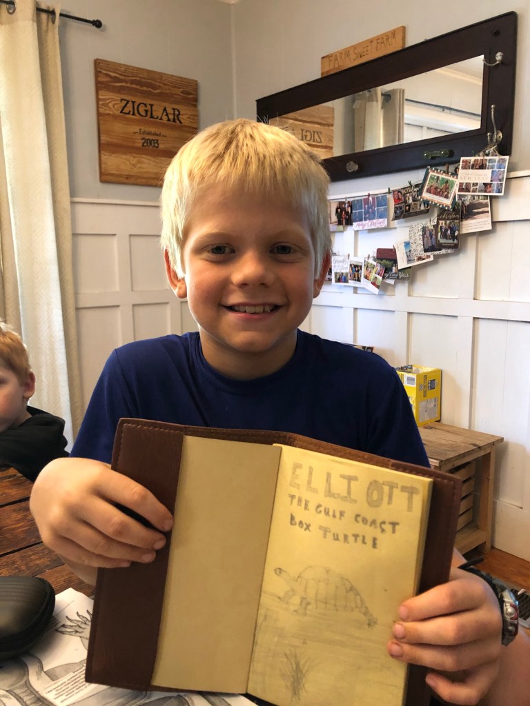 You might be wondering while I provided so many seemingly useless details. Here is why: instead of coming home frustrated with the dogs, frustrated with the loss of thirty minutes of my precious time, I decided to look at the silver lining. I went straight to the kitchen, de-stemmed the elderberry and made a beautiful, aromatic, delicious elderberry tea (cardamom, cloves, cinnamon, lemon juice, turmeric, ginger). The kids were forced to be more independent in their lessons today because I was unavailable. We are beginning a study of turtles with our nature group for September, beginning Friday. We now have a live specimen to study. So we set aside our normal school subjects (minus Bible) and focused on studying this Panhandle Box Turtle. The kids created a beautiful habitat for him (I have a video of his habitat but pictures don’t do it justice. They fastened three rabbit hutches together. They buried a pan for his pond and planted plants around the pond. They made a “play” area for him with a log and then a “sleep” area for him with a glass jar filled with rocks). They sketched drawings of him. We learned what he likes to eat, what his habits are and how we can best care for him over the next month. And we will forever remember this day. Graham said to me later, “Isn’t it so neat Mama that because the dogs got out, we were able to find the turtle!”