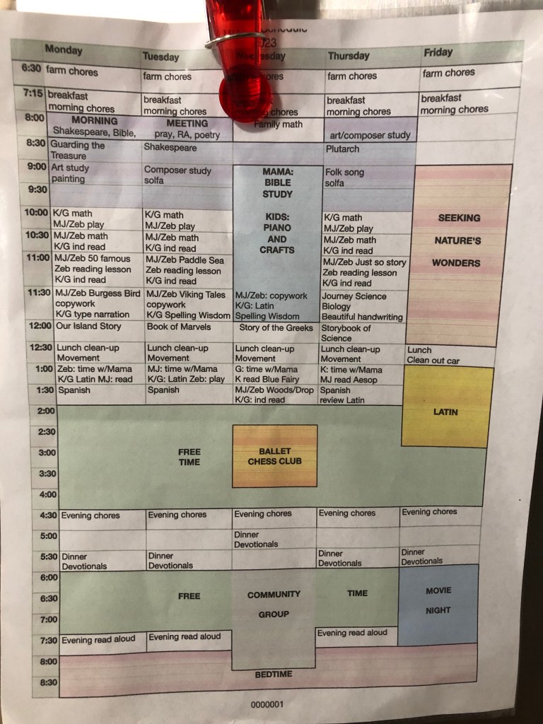 Wednesday and Friday are our busy days when we are out of the house more. Wednesday morning I have a precept Bible study and the kids spend time with both of their grandmothers for piano lessons, crafts and sewing. We are back together for lunch and a few school items and then ballet for the girls and chess club for the boys is Wednesday afternoons for an hour. We come back home to finish up any school before heading to church for our small group meetings.